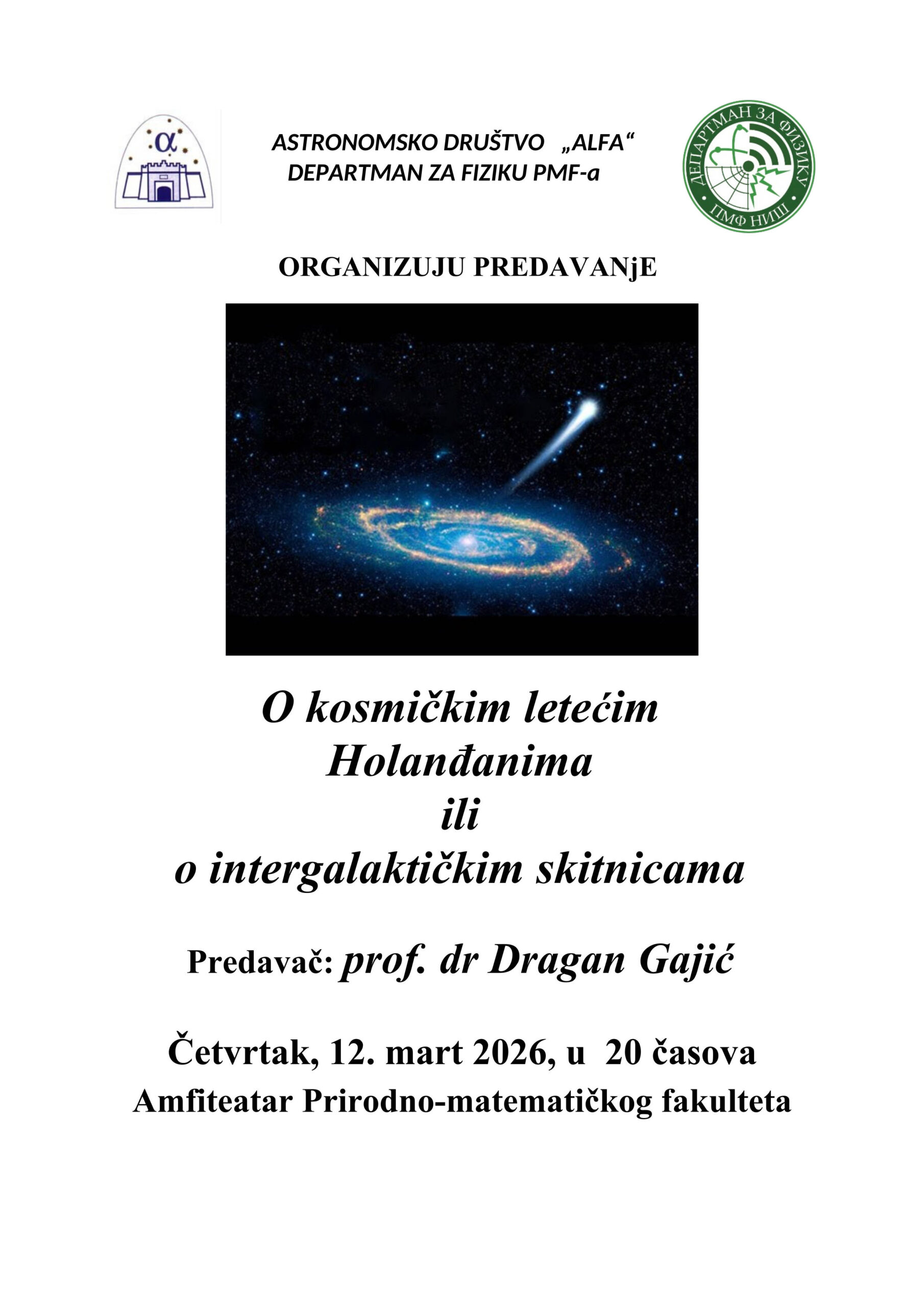 Predavanje će biti održano u četvrtak, 12.3.2026. godine, u amfiteatru Prirodno-matematičkog fakultata, sa počektom u 20 časova.
