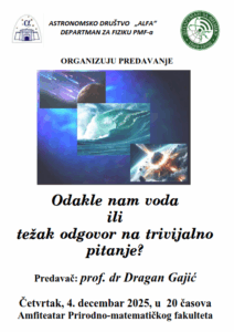 U četvrtak, 4. decembra, sa početkom u 20 časova Astronomsko društvo „Alfa“, u saradnji sa Departmanom za fiziku Prirodno-matematičkog fakulteta u Nišu, organizuje predavanje